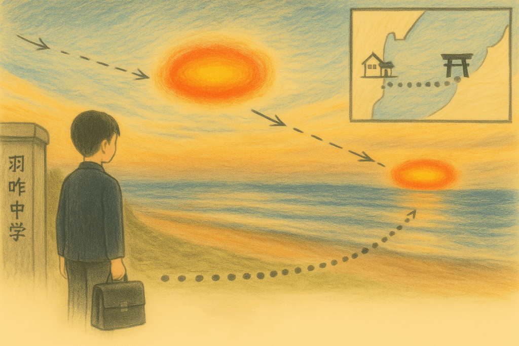運営者・松永の父が中学生だった当時の午後2時ごろ、羽咋中学校の正門前を歩いていたとき、無音のまま橙色の三層に輝く巨大な楕円体が志雄(しお)方面から現れ、千里浜海岸(気多大社の方角)の沖へものすごい速度で向かい、数秒で消えた——そんな目撃談が残っています。中央がひときわ濃い、三層の橙色に重なる光は、いまも松永の父の心に焼きついています。